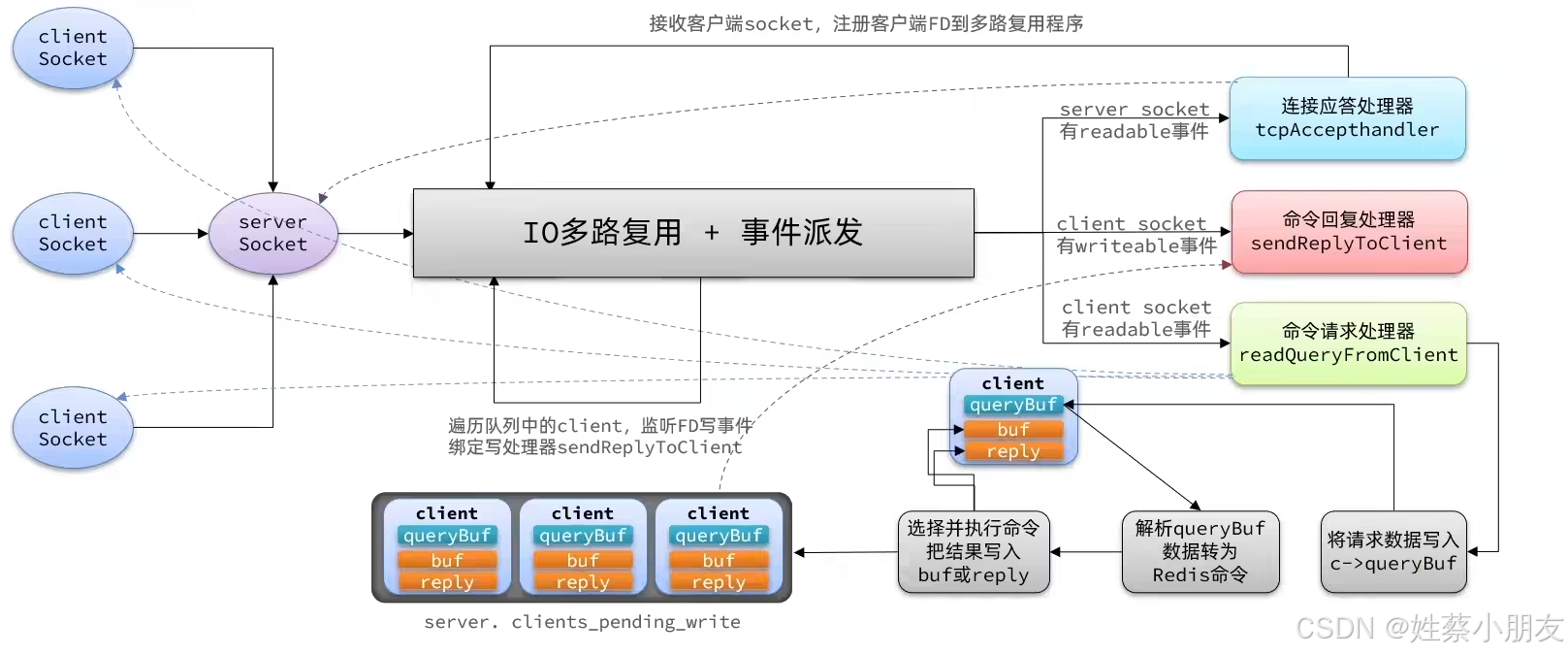 因此,Redis中的I/O多路复用可以理解为:复用 epoll同时监听客户端连接请求、客户端读请求、服务器向客户端的写请求 ,并每隔一段时间接收多条请求,针对不同请求使用不同的分支监听读处理函数step11、读处理函数step17+18、写处理函数step21 处理请求。