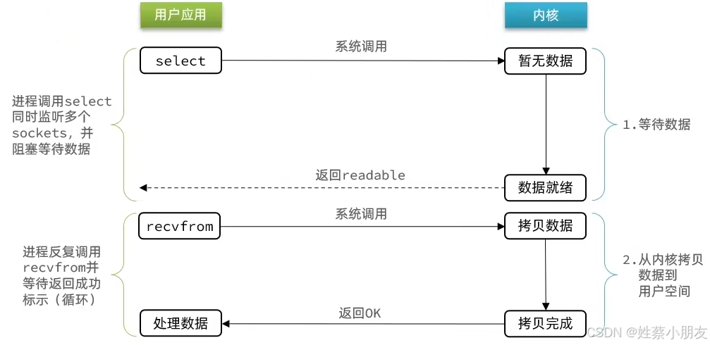 - 单线程 调用select()函数,触发系统调用 ,进程从用户态切换到内核态 ,并将三个数组拷贝到内核态。