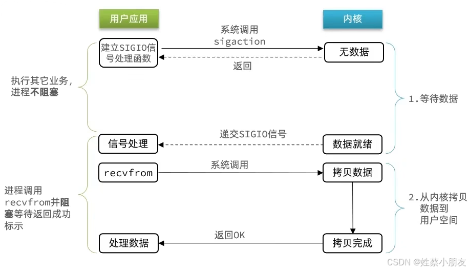 信号驱动I/O通过sigaction()系统调用对fd设置回调函数 ,此时线程立即返回用户态 执行其他任务。当fd的数据到达内核缓存时会触发 回调函数,将就绪的fd拷贝到用户态的信号队列 并通知 线程。线程调用recvfrom进入内核态将数据拷贝到用户内存。