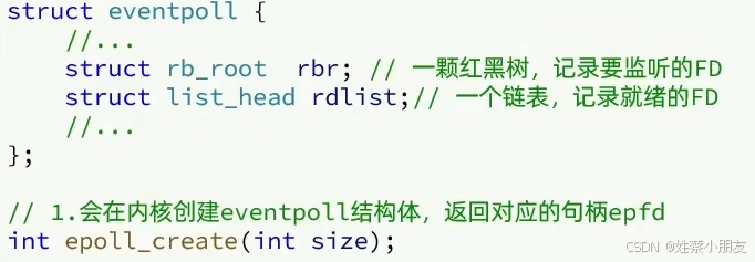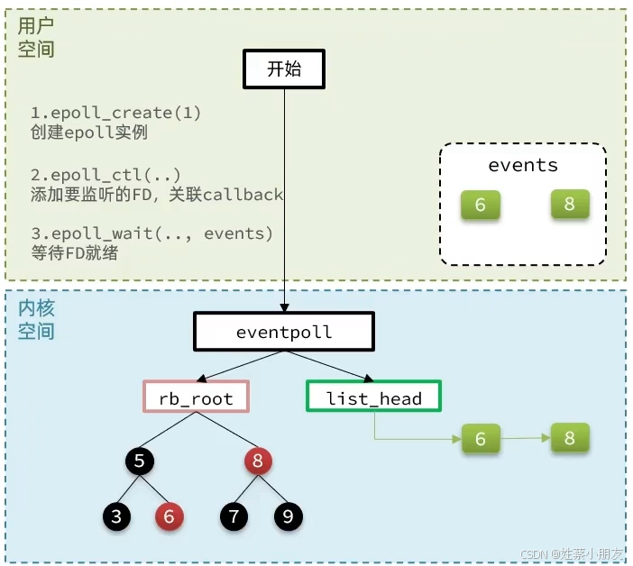 epoll维护一棵红黑树和一个链表 ,红黑树记录要监听 的文件描述符fd,就绪链表记录已就绪 的文件描述符fd。与select最大的不同在于,epoll在内核态初始化 (epoll_create系统调用),不会频繁的在用户态和内核态拷贝。