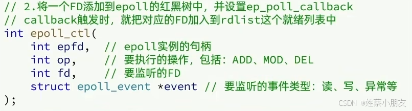 由于在内核态,所以当线程通过accept()与客户端建立连接后,需要通过epoll_ctl()系统调用 向epoll的红黑树中添加fd 。此外,添加时会对fd设置一个回调函数,回调函数会在fd的数据写入内核缓存(触发中断响应)时将fd添加到就绪链表中。