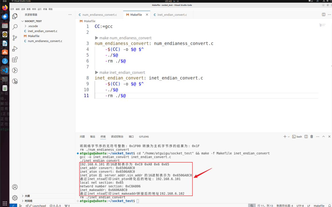 介绍完所有的字节序内容之后,我们来看一段代码实例,该文件来自于尚硅谷 Linux 应用层开发课程: