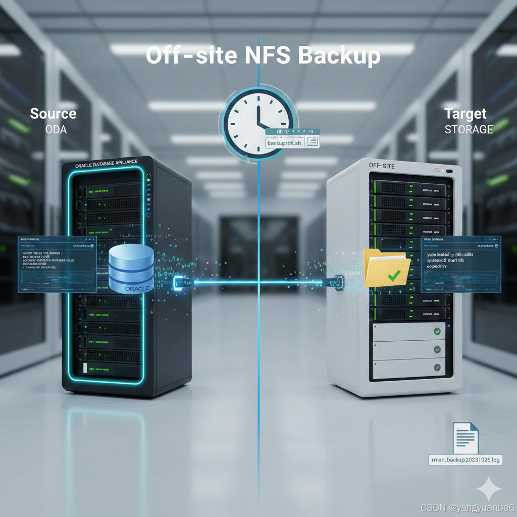 先把 NFS 这条"备份通道"从网络、端口、挂载一路打通,再让 RMAN 把备份流量全部导到这条通道上,最后用 cron 把这件事每天自动干。