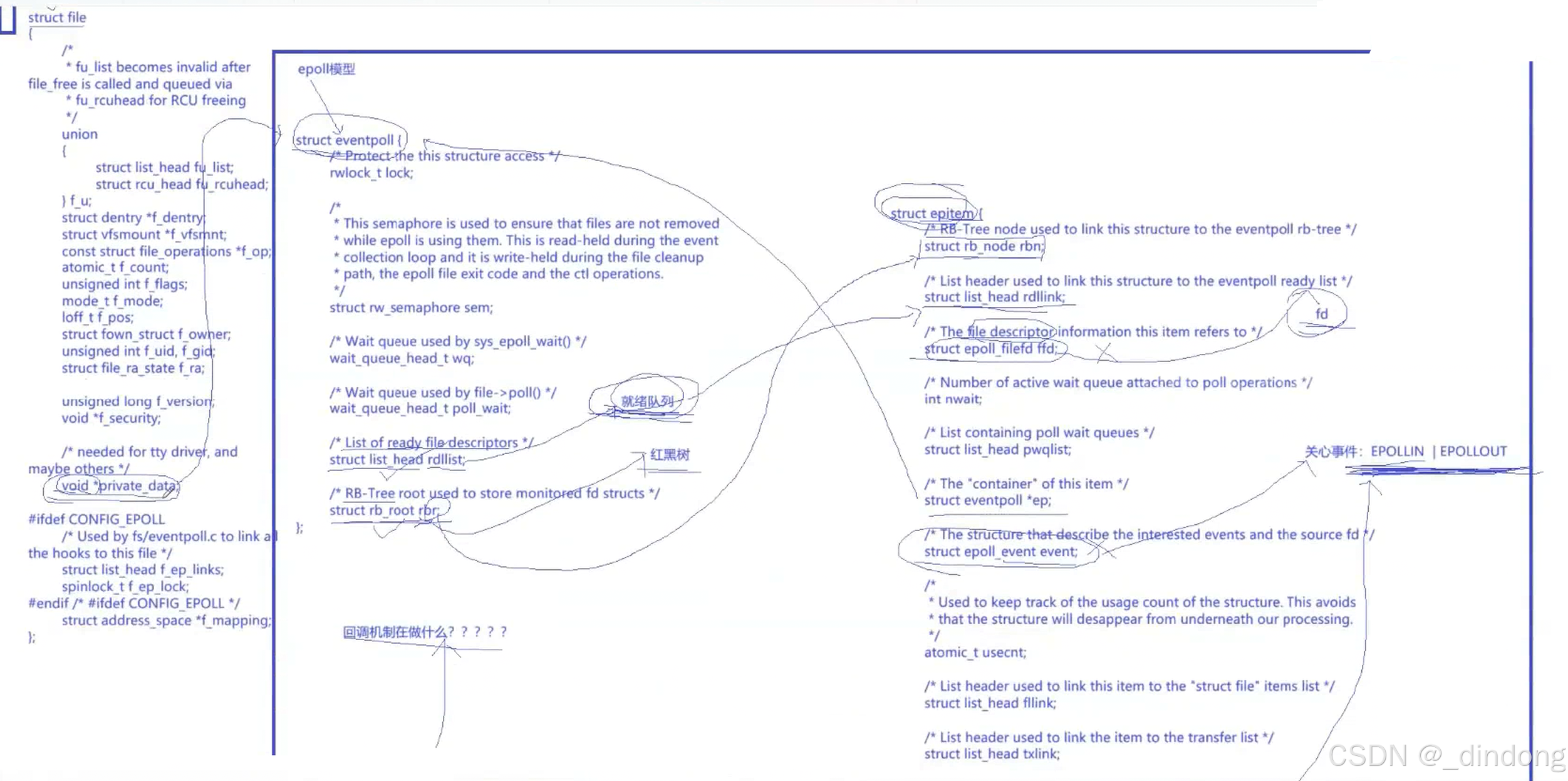简单来说,epoll的高效就在于它从"主动轮询"变成了"事件回调" 。不是每次去问所有连接"你好了没?",而是让每个连接在"好了"的时候主动来报告。eventpoll是总管,epitem是每个连接的代理人,而 file结构体则是连接它们与具体文件(如 socket)的桥梁。