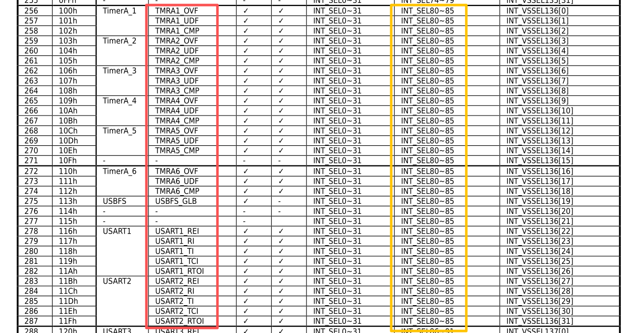 多源共享:中断源选择上相对固定,但是单个向量可服务于多个外设中断。比如以下中断源可以共享136号中断: