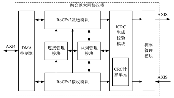 RoCE v2 发送模块及 RoCE v2 接收模块则负责发送或接收 RoCE v2 数据包。其中,RoCE v2 发送模块从队列管理模块中提取用户指令并将其转换为 RoCE v2 包,然后发送到远程主机。对于包含数据的 RoCE v2 包,RoCE v2 发送模块将同时与 DMA控制器进行数据交换,从系统存储中读取数据后发送到远程主机。同样的,RoCE v2接收模块接收并解析 RoCE v2 数据包,而后根据包类型与 DMA 控制器进行数据交换,进行数据读取或写入操作。同时其也将包信息发送到队列管理模块以实现指令释放。