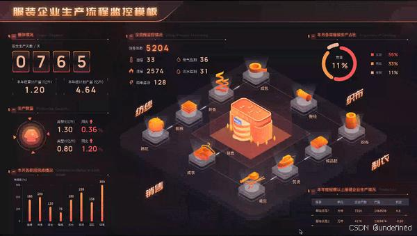 工业场景中,服装生产面临预售模式取消后的供应链压力,智能生产监控大屏实现从纺纱到销售的全流程数据可视化,累计产量、各环节完成度、设备运行状态实时呈现,帮助企业精准把控生产节奏;