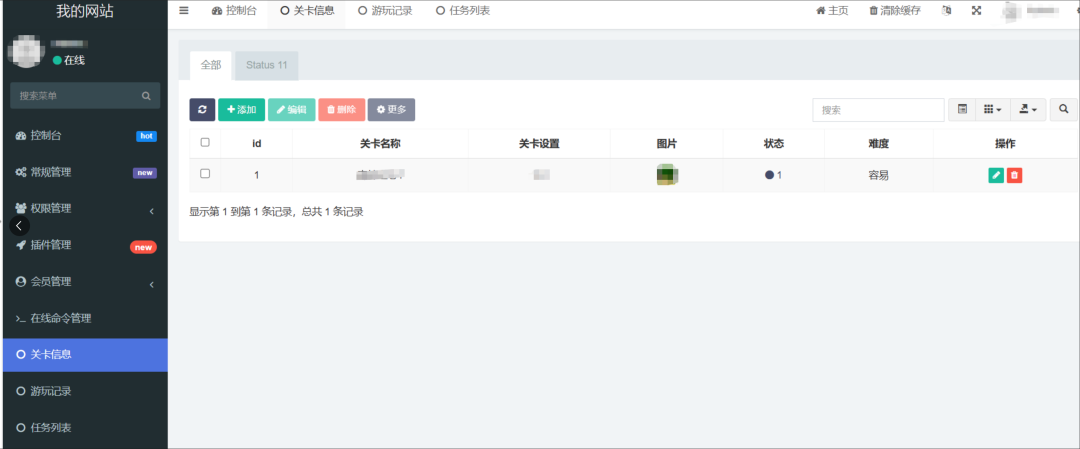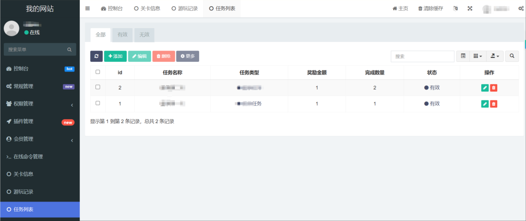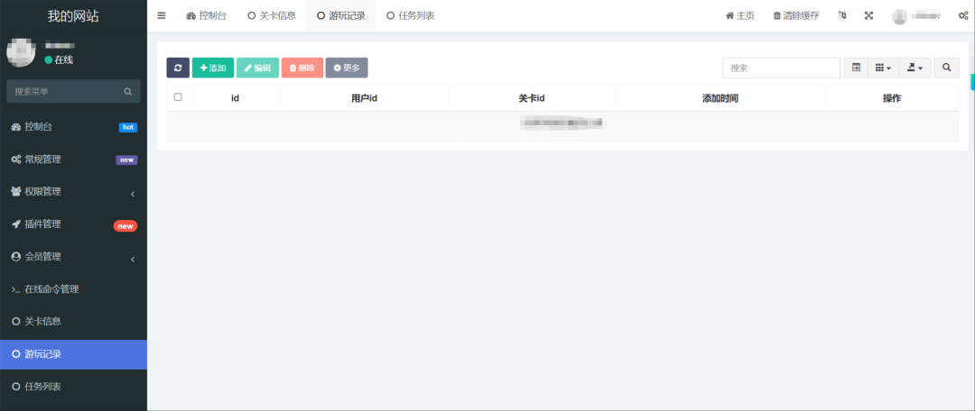 权限管理、插件管理、会员管理、关卡信息、游玩记录、任务列表
