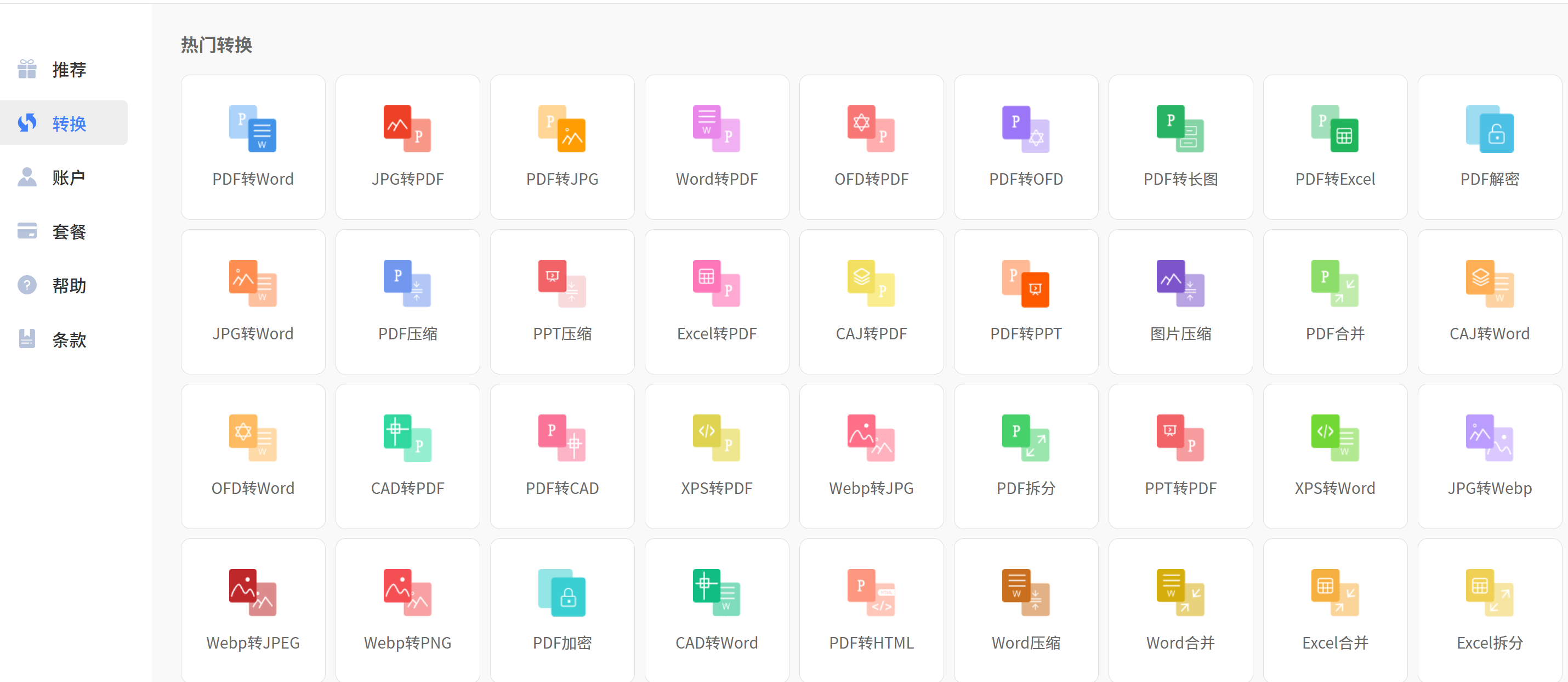 此PDF在线转换器支持各类转换包括Word转PDF,Excel转PDF,PowerPoint转PDF,JPG转PDF,PDF转Word,PDF转JPG等。
