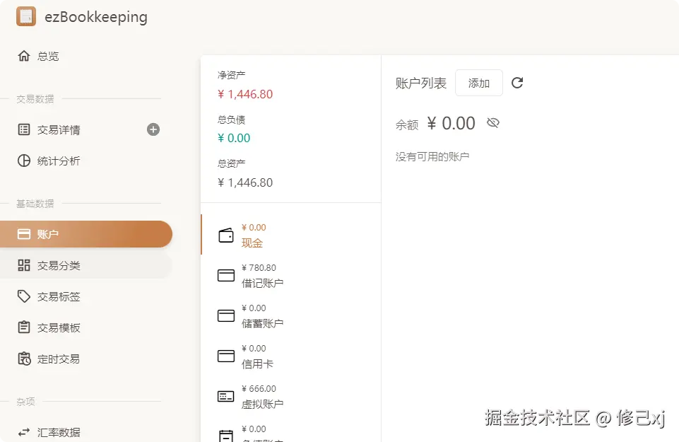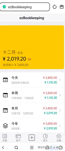 ezBookkeeping 是一款轻量、自托管 (self-hosted) 的个人记账应用,拥有用户友好的界面和强大的记账功能。它部署简单,借助 Docker 只需一行命令即可启动。同时对系统资源占用低、可扩展性高,既可运行在树莓派等轻量设备上,也能扩展到 NAS、MicroServer 甚至集群环境。