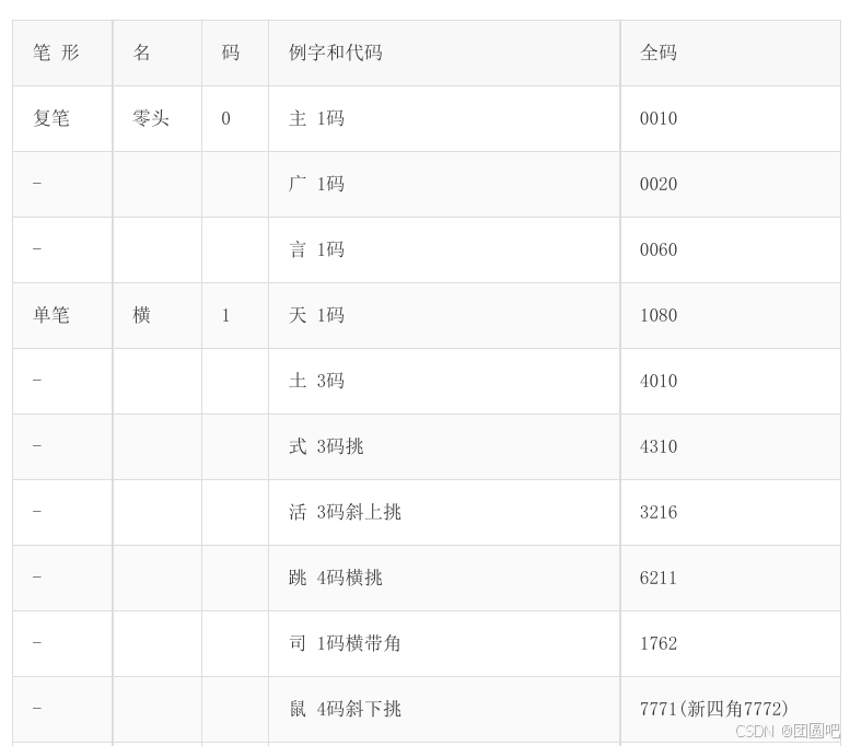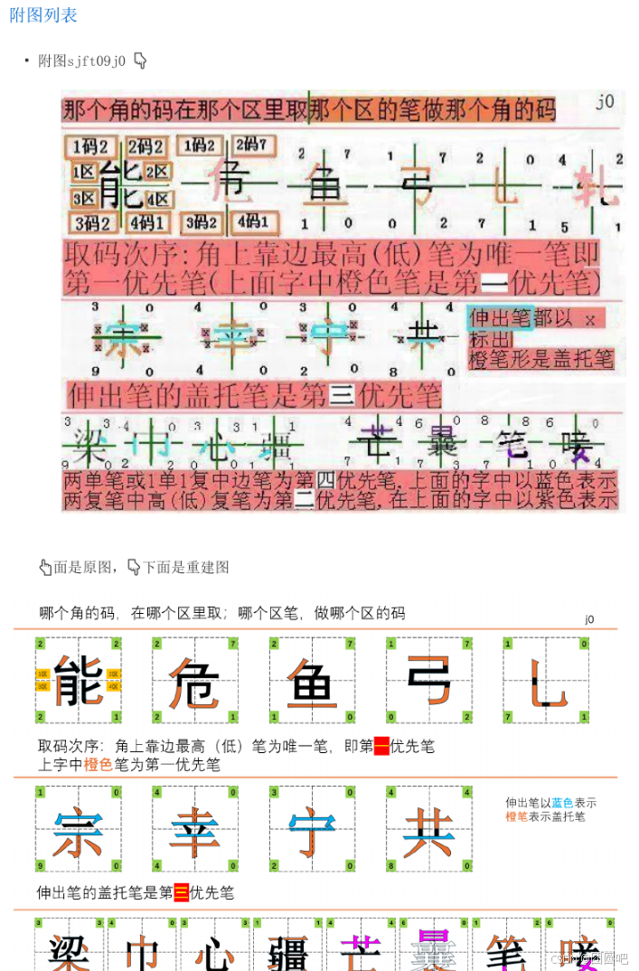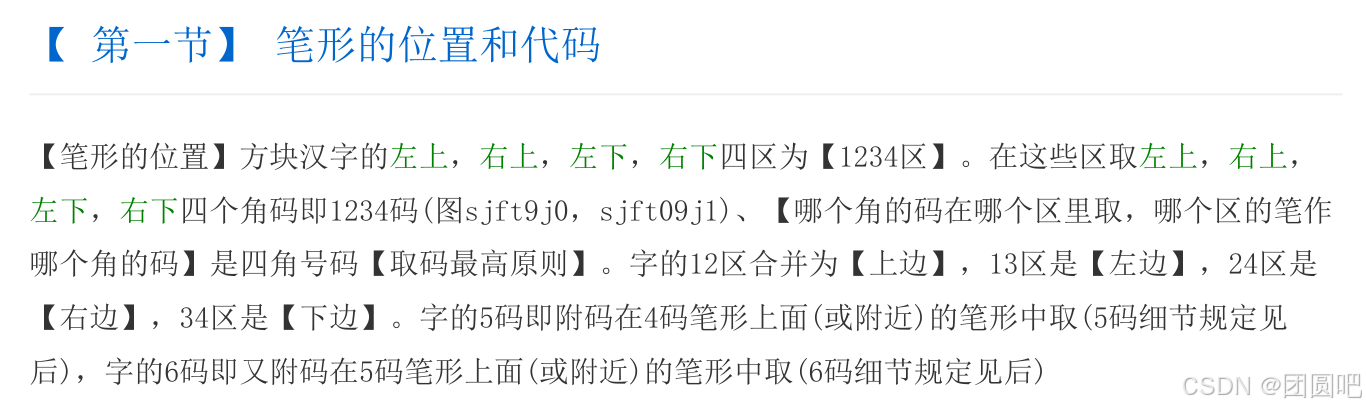 【笔形的位置】方块汉字的<font color=green>左上</font>,<font color=green>右上</font>,<font color=green>左下</font>,<font color=green>右下</font>四区为【1234区】。在这些区取<font color=green>左上</font>,<font color=green>右上</font>,<font color=green>左下</font>,<font color=green>右下</font>四个角码即1234码(图sjft9j0,sjft09j1)、【哪个角的码在哪个区里取,哪个区的笔作哪个角的码】是四角号码【取码最高原则】。字的12区合并为【上边】,13区是【左边】,24区是【右边】,34区是【下边】。字的5码即附码在4码笔形上面(或附近)的笔形中取(5码细节规定见后),字的6码即又附码在5码笔形上面(或附近)的笔形中取(6码细节规定见后)