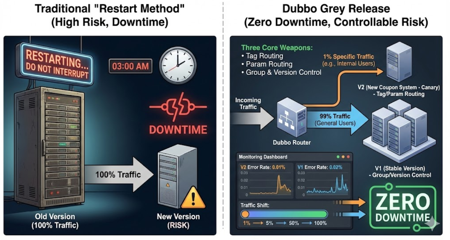 而在以Dubbo为核心的现代微服务架构中,灰度发布(金丝雀发布) 让你可以像外科手术一样精准:只让1%的特定用户(如内部员工)访问新优惠券服务 ,其余99%的用户依然使用稳定版本。经过监控验证,再逐步将流量比例提升至5%、50%,直至100%,整个过程服务零中断 ,风险极度可控。