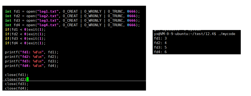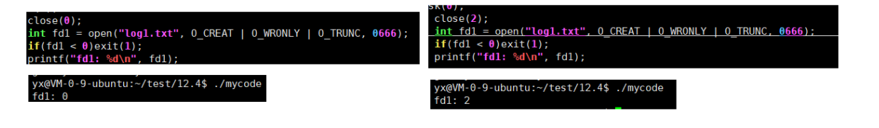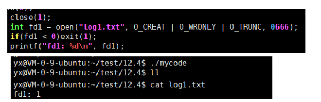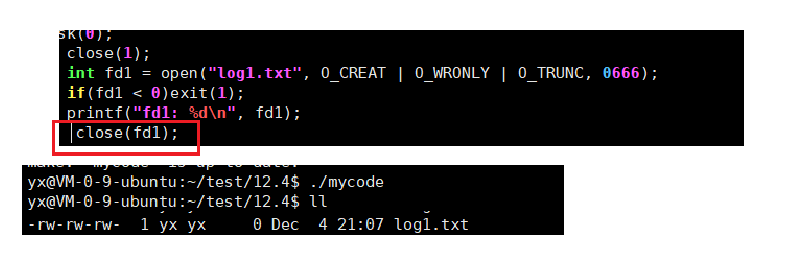 上面是没有在最后加close(fd)的现象,但是加上close后发现不仅该程序没有打印出内容而且新建的文件log1.txt里面的内容也是空的? 这在之后学习的缓冲区会知道,这里先不管,先不加close