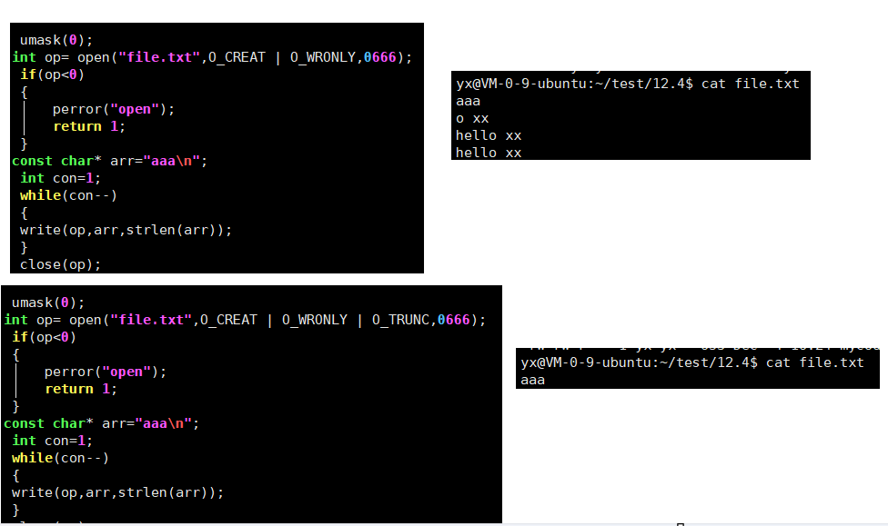 但是此时再重新向该文件写入(aaa\n)后,我们发现新写的内容(aaa\n)把原来的内容(hell)给替换掉了,而剩下的内容还在。和我们c库里的fopen不同(fopen 以w方式打开会直接清空内容),**系统调用的open不会默认清空原来的内容。**如果需要清空原来的内容,第二个参数还需要带上O_TRUNC,带上后再次运行发现果然就清空了原来的内容。