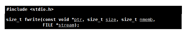 ptr:指向要写入的数据块的指针。size:每个数据项的大小(以字节为单位)。nmemb:要写入的数据项的数量。stream:指向FILE对象的指针,该对象指定了要写入的文件流。返回值为成功写入的数据项的数量,如果与nmemb不同,说明发生了错误。