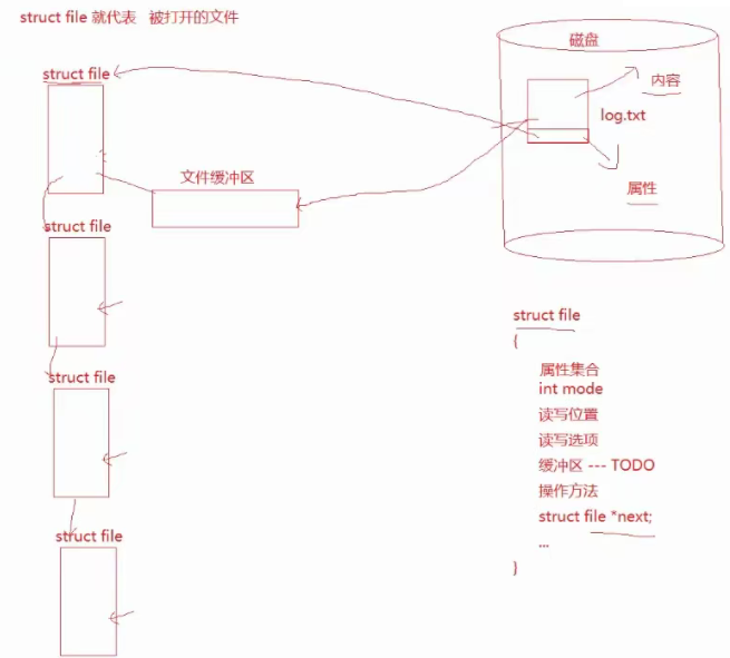 如下,每打开一个文件,操作系统就会创建一个struct file来对该文件进行管理,里面包含着文件的各种属性,在该结构体中还存在着文件缓冲区,文件内容会被加载到文件缓冲区中,这样一个文件的内容和属性就被一个结构体对象管理起来了,而各个结构体对象之间再通过链表连接起来,此时系统对文件的管理就转换为对这链表的管理。