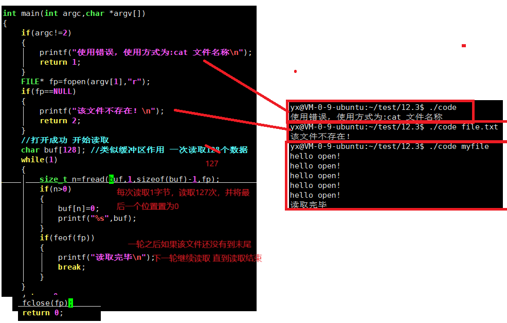 read的参数和write是类似的,对于返回值,返回成功会返回读到字节数,==0说明到了文件结尾,小于0说明读取失败
