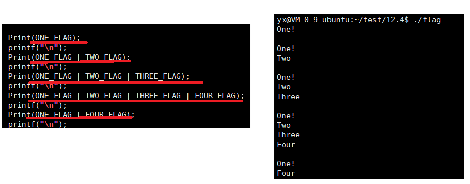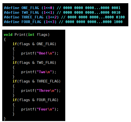 如下,宏定义中每一个参数二进制位中只有一个是1其他都为0,而Printf函数会拿参数flags与每一个这样的宏做按位与的操作,这样传的参数flags二进制中哪一位为1就会触发一个选项。