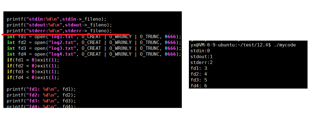 FILE是一个结构体,那么stdin、stdout、stderr就是FILE类型的指针,而里面又存在着pd信息,那我们可以用stdin->_fileno的方式来把fd为0 1 2也给打印出来
