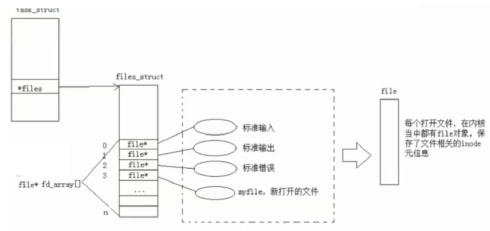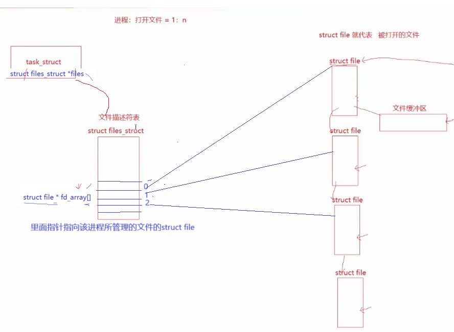 每一个进程的task_struct中会有一个file_struct* 的指针,而file_struct中会有一个存着file*的指针数组fd_arry ,而fd就是这个数组的下标,通过数组里面的指针指向的就是刚刚提到的操作系统管理文件的结构体 。