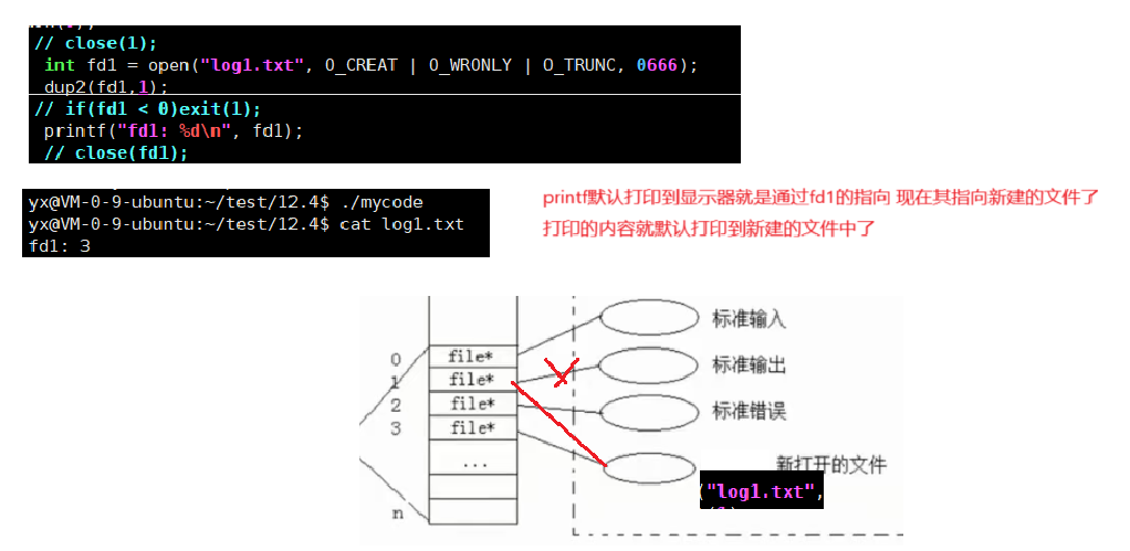 这是因为原来fd为1指向的是标准输出,现在把fd为1的文件给关闭了,新建的文件log1.txt的fd为1了,也就是fd为1指向了我们新创建的文件log1.txt。而print函数我们知道它默认打印的是打印到stdout文件中(也就是显示器)的,而这个**指定的方式就是通过这个fd1,**而现在fd1指向的是log1.txt,所以printf现在所默认打印的地方就是我们新建的文件log.1txt了!