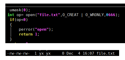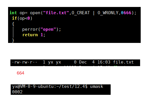 如下,新建的文件指定为0666(也就是拥有者、所属组、other都是rw权限),但是新建的文件权限是664,因为存在权限掩码(这些都是在权限学过的内容)。