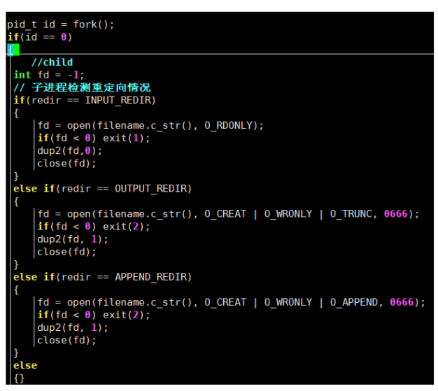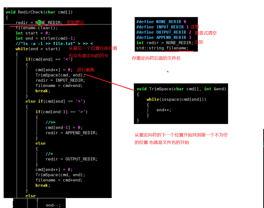 执行的时候,它不是内建命令,由子进程根据重定向的符号(通过redir)来控制open的第二个参数,进而决定打开该文件用的什么方式打开,然后用dup2函数来改变相应的标准输入或者标准输出文件描述符表的指针指向。 然后进行程序替换,程序替换之后代码和数据进行替换,文件描述符的指针指向会继承下去不会恢复。