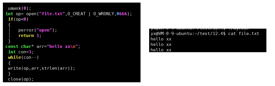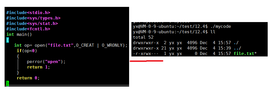 如下,用(只写 | 创建) 打开一个文件,这个文件不存在就会新建,而这个新建的文件权限和我们正常新建的权限并不同?