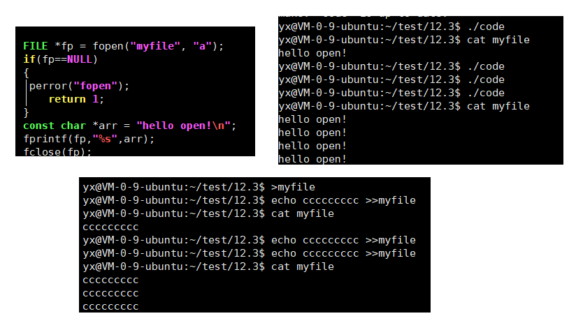 而我们知道c库里面的函数其实是对系统调用进行了封装,所以对应c库的fopen中的w就是系统调用open第二个参数(写入+清空)的封装,而c库的fopen中的a就是系统调用open第二个参数(写入+追加)的封装。
