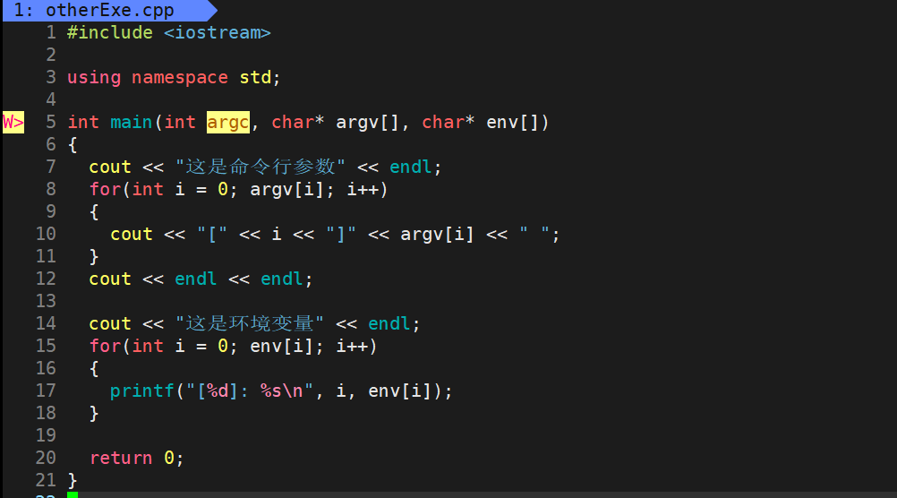 对于C++程序,在linux中c++文件的后缀可以是cxx,可以是cc,同样也可以是cpp,但是由于cpp更为熟悉,所以我们这里使用cpp为后缀进行讲解,这里编写的c++程序可以打印命令行参数和环境变量