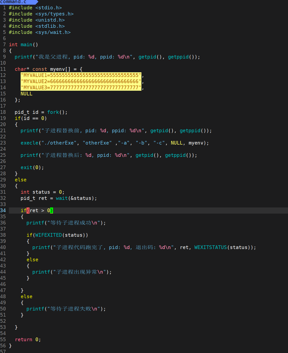 子进程行为:替换前打印自身 pid (与父进程 pid 不同);调用 execve 替换为 ./otherExe 程序,并传递参数 -a / -b / -c 、传递环境变量 ;由于 execve 执行成功,子进程后续的 printf / exit 未执行(符合 exec 函数的特性);execve 的作用:子进程完全替换为 otherExe ,执行 otherExe 的逻辑(打印命令行参数、环境变量)。