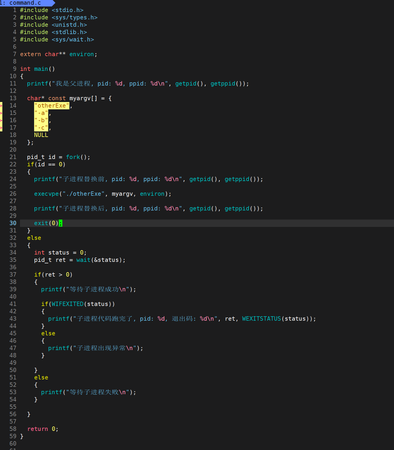 - 命令行参数传递成功: otherExe 打印出了 [0]otherExe [1]-a [2]-b [3]-c ,说明 myargv 数组的参数被正确传递;