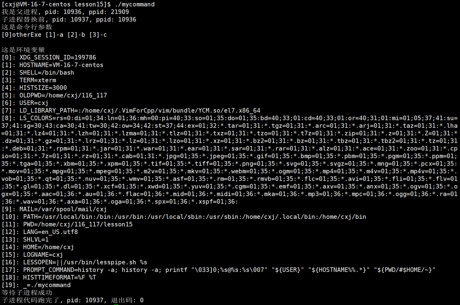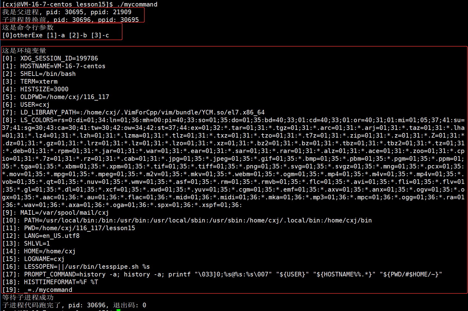 - 环境变量传递成功: otherExe 打印出了系统环境变量(如 SHELL / HOME 等),说明 environ (全局环境变量数组)被正确传递;