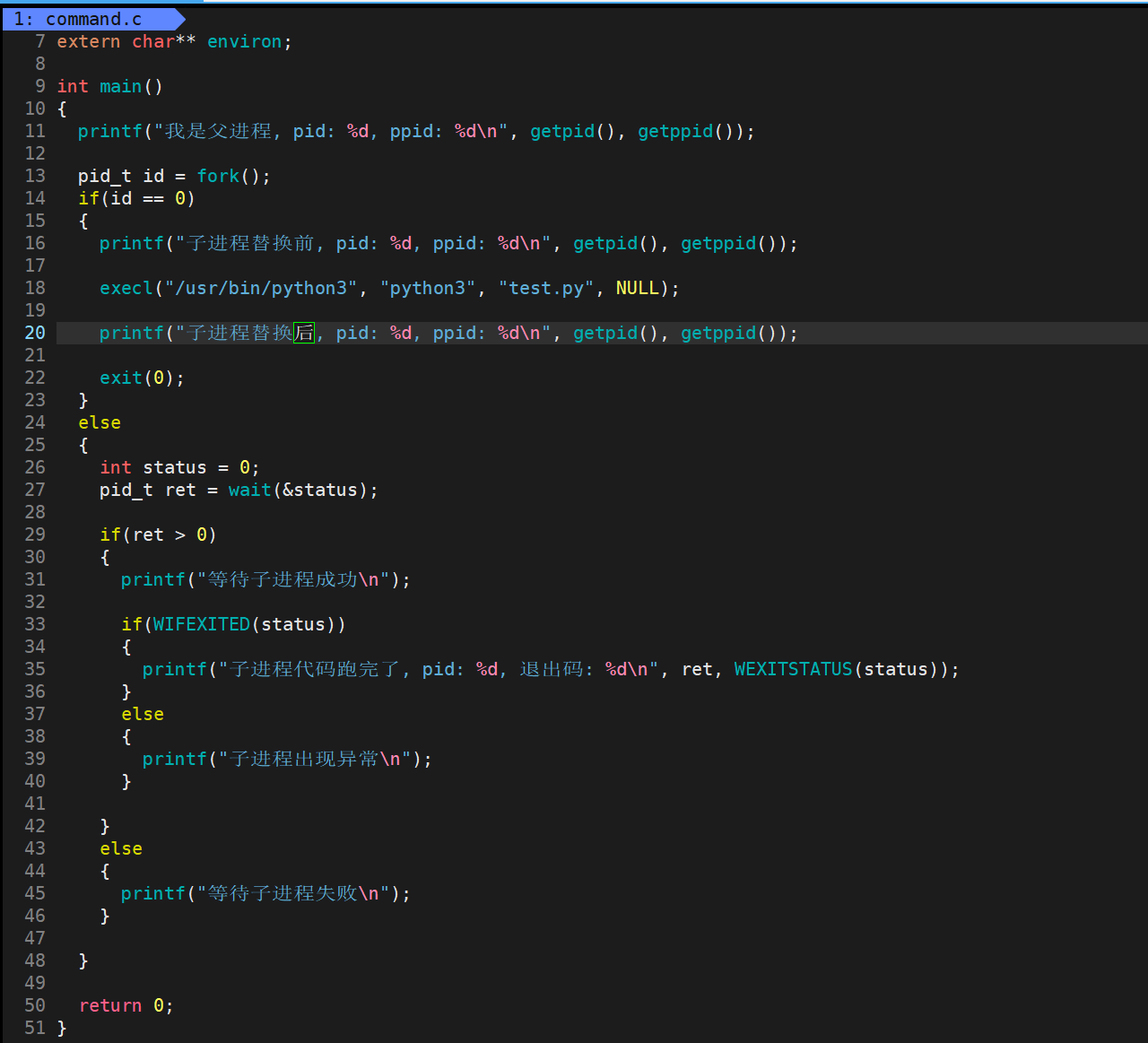 那么接下来我们使用exec系列函数,以execl为例将fork的子进程程序替换后执行,这里的路径就应该是可执行程序python3的路径,即/usr/bin/python3,选项中带上python3加python程序文件加NULL即可