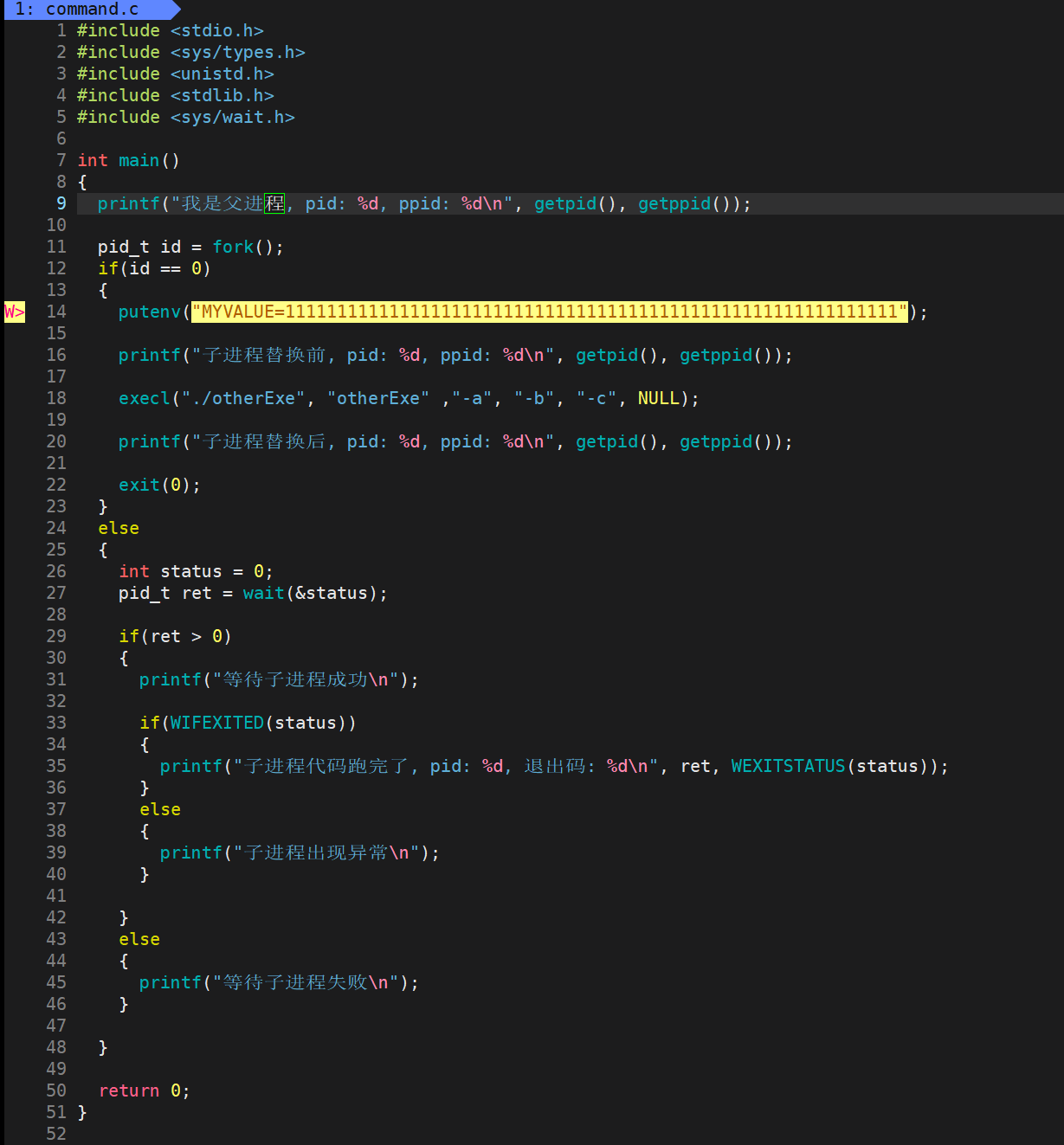 第一种方式,使用库函数putenv的方式(putenv可以新增环境变量到父进程中,这样fork子进程后,子进程自然而然继承父进程后也继承到了新增环境变量,同样可以在if-else代码分流的子进程中在子进程的代码区域putenv新增环境变量,putenv父进程和子进程上的区别就是是否修改父进程环境变量),给子进程新增环境变量