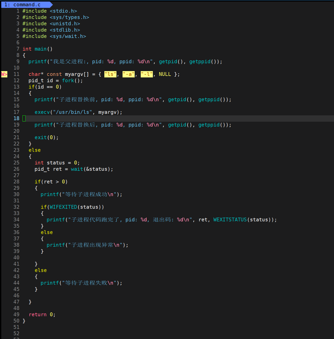 那么下来我们使用fork创建子进程的方式,让子进程进行程序替换,让子进程执行ls命令,而父进程则一直wait阻塞式等待子进程即可