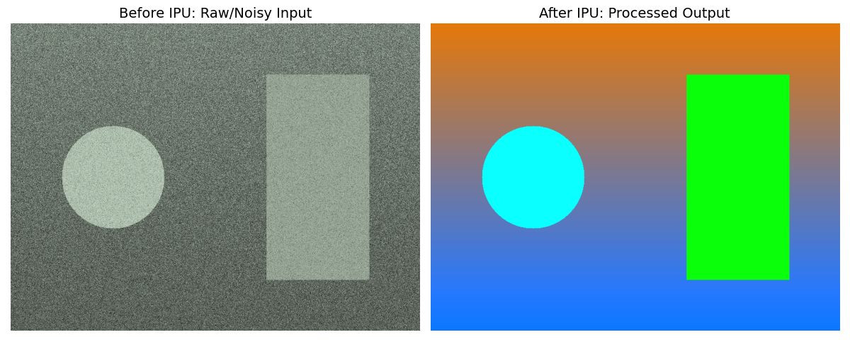 下图展示了 IPU 处理前(Raw Domain 模拟图)与处理后(经过 ISP 管道)的视觉差异。