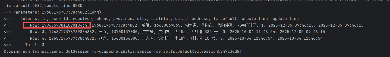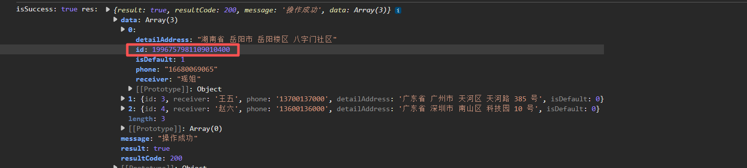 这个问题是 JavaScript 数字精度丢失导致的 ------ 后端返回的地址 ID(如1996757981109010434)是超过了 JavaScript 安全整数范围(2^53 - 1,即9007199254740991)的大整数,前端接收后会自动转成近似值(如1996757981109010400),从而出现 ID 不一致的情况。