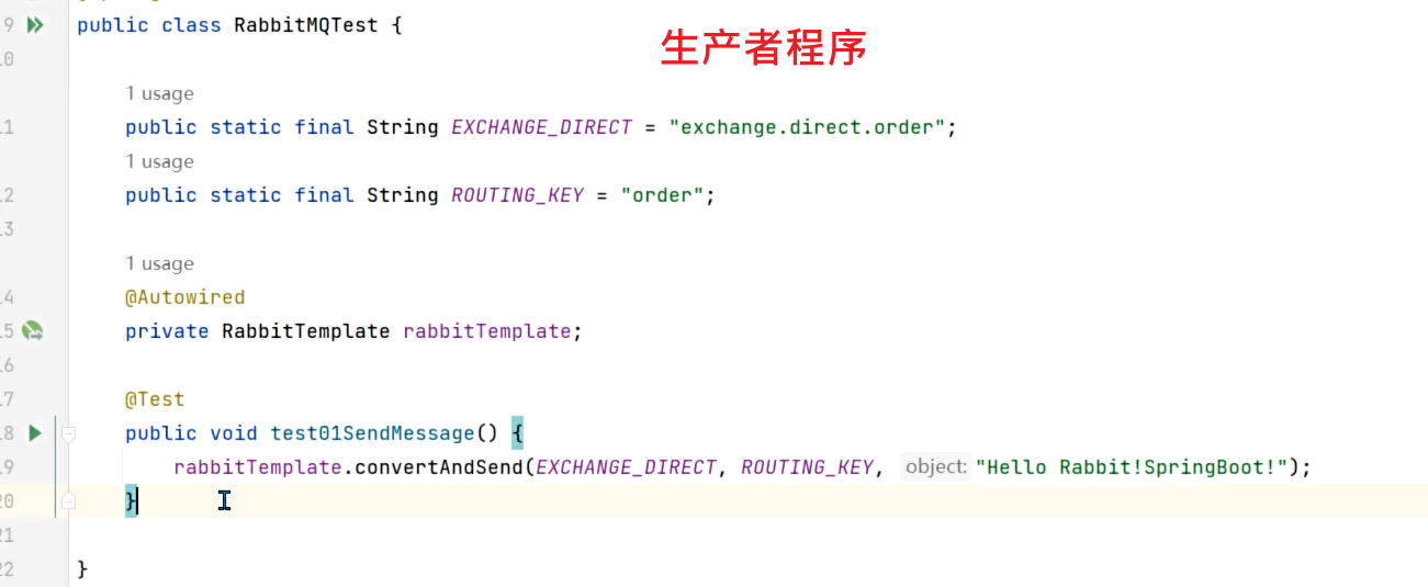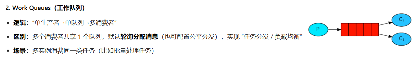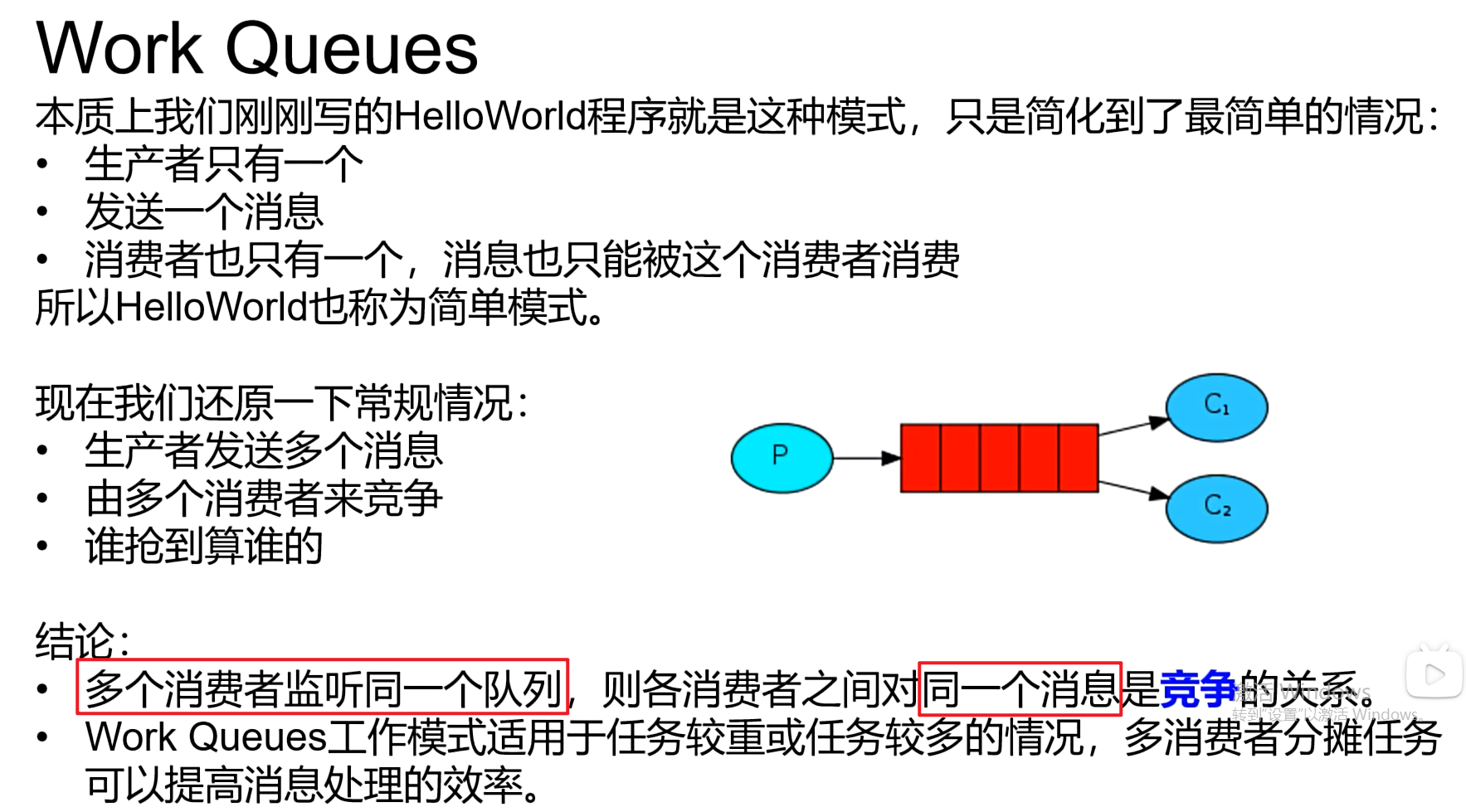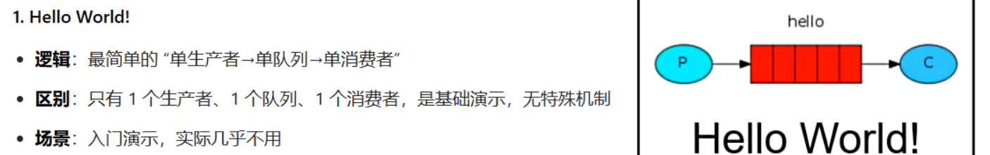 2.3 HelloWorld级别代码实现- 单个生产者,与MQ连接成功,选个默认交换机,指定单个队列发送,给队列发1条消息; - 单个消费者,与MQ连接成功,选个默认交换机,指定单个队列监听,接收队列里的1条消息;