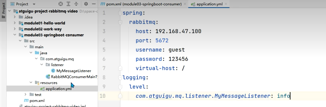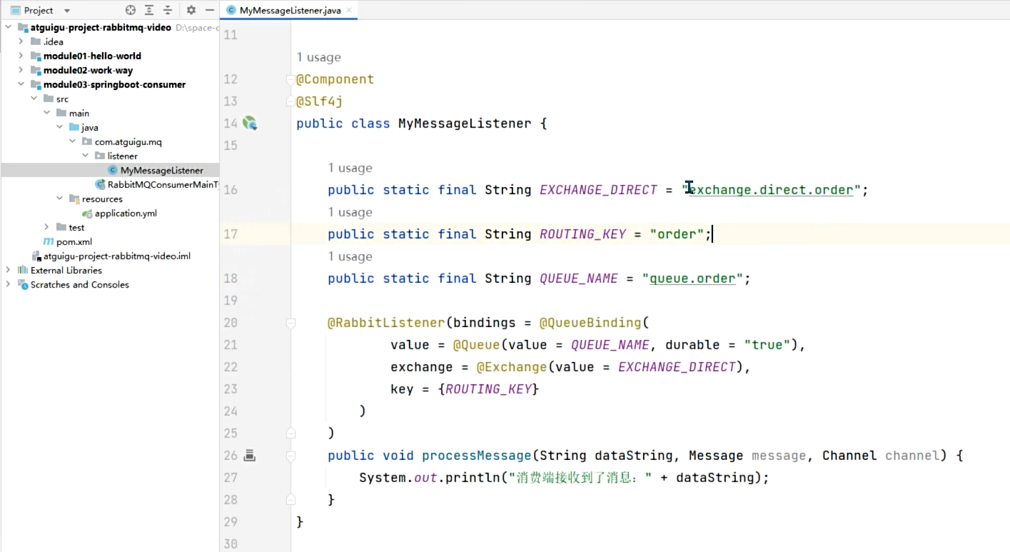 // 消费者类似一个监听程序, 主要是用来监听消息