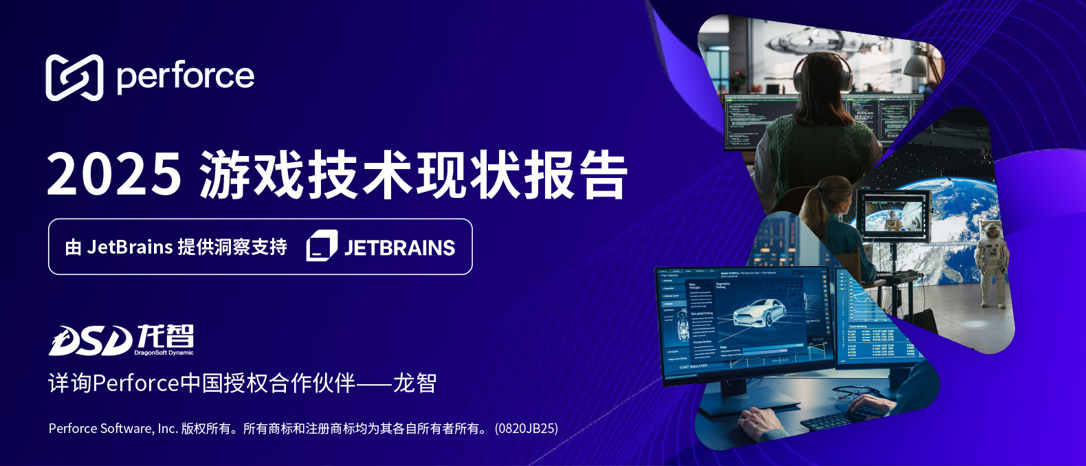 **Perforce《2025游戏技术现状报告》现已正式发布,由JetBrains提供洞察支持。**该报告基于对全球521位来自游戏、媒体与娱乐、汽车与制造业等行业领袖及创作者的深入调研,全面揭示了游戏引擎与生成式AI如何作为核心驱动力,从"实验探索"迈向"业务必需",并正在重新定义各行业的创新边界。