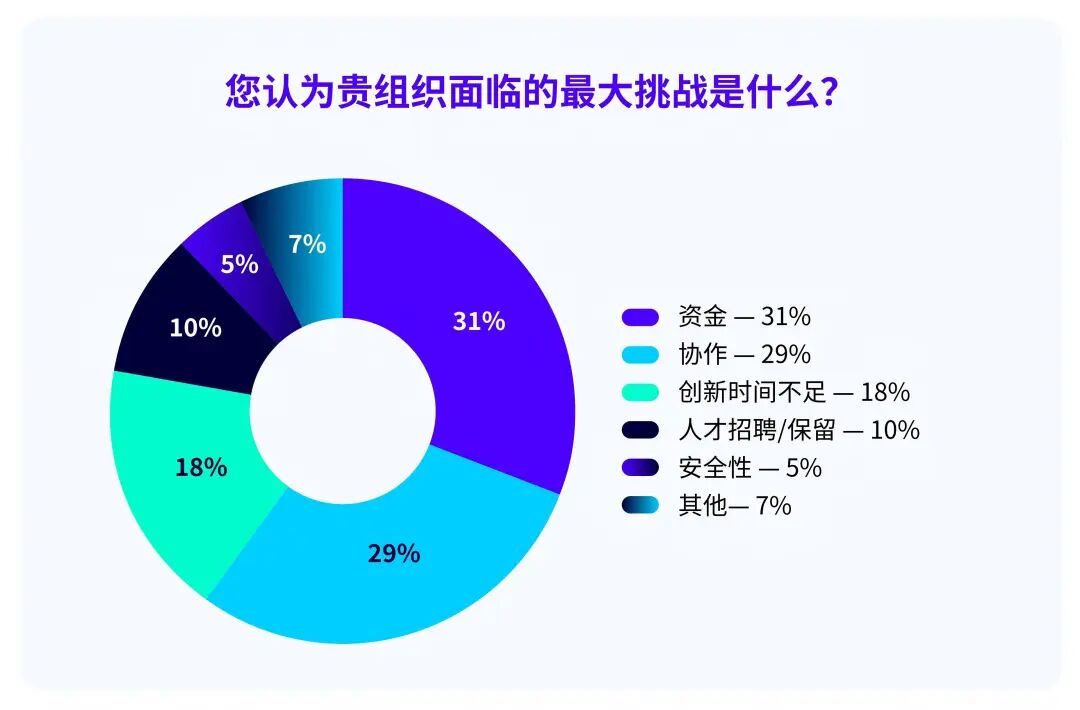 资金限制仍持续影响着各行业的决策,31% 的受访者将其列为首要挑战,虽较去年(36%)有所下降。
