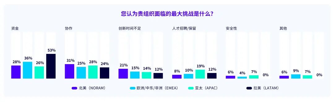 **资金:**在拉美(LATAM,53%)和欧洲/中东/非洲地区(EMEA,36%),资金是最大障碍,反映出这些地区的全球经济不确定性与地区贸易政策的影响。