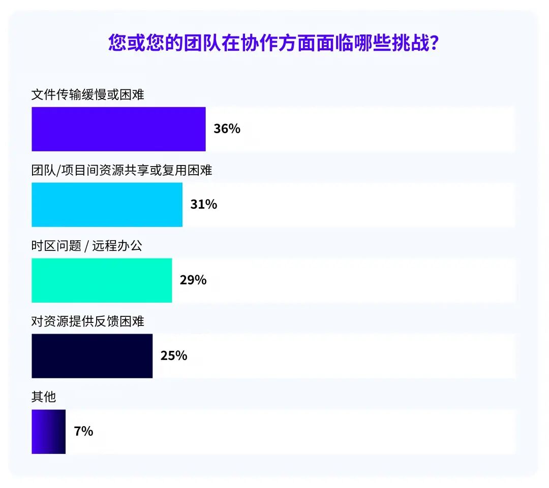这些挑战因行业而异。在游戏(37%)和媒体与娱乐(42%)领域,文件传输问题尤为突出。而在汽车与制造(64%)以及教育领域(44%),资源共享与复用则是最大的障碍。