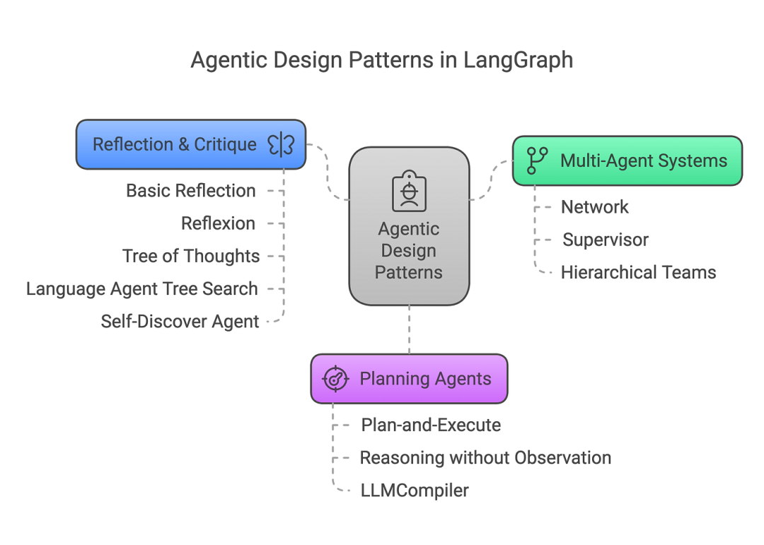 1\] \[Network\](https://langchain-ai.github.io/langgraph/tutorials/multi_agent/multi-agent-collaboration/) \[2\] \[Supervisor\](https://langchain-ai.github.io/langgraph/tutorials/multi_agent/agent_supervisor/) \[3\] \[Hierarchical Teams\](https://langchain-ai.github.io/langgraph/tutorials/multi_agent/hierarchical_agent_teams/) \[4\] \[Plan-and-Execute\](https://langchain-ai.github.io/langgraph/tutorials/plan-and-execute/plan-and-execute/) \[5\] \[Reasoning without Observation\](https://langchain-ai.github.io/langgraph/tutorials/rewoo/rewoo/) \[6\] \[LLMCompiler\](https://langchain-ai.github.io/langgraph/tutorials/llm-compiler/LLMCompiler/) \[7\] \[Basic Reflection\](https://langchain-ai.github.io/langgraph/tutorials/reflection/reflection/) \[8\] \[Reflexion\](https://langchain-ai.github.io/langgraph/tutorials/reflexion/reflexion/) \[9\] \[Tree of Thoughts\](https://langchain-ai.github.io/langgraph/tutorials/tot/tot/) \[10\] \[Language Agent Tree Search\](https://langchain-ai.github.io/langgraph/tutorials/lats/lats/) \[11\] \[Self-Discover Agent\](https://langchain-ai.github.io/langgraph/tutorials/self-discover/self-discover/)