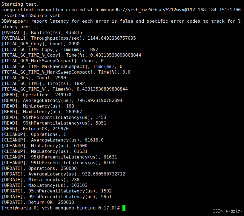 压测完成后,YCSB会输出关键性能指标,重点关注以下内容: