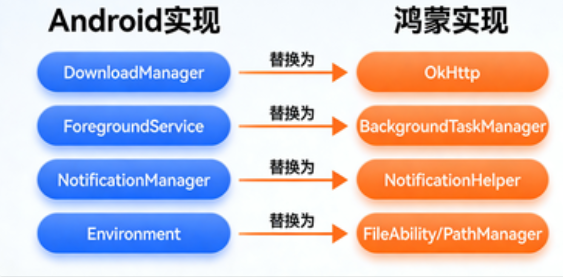 MethodChannel/EventChannel; - 适配系统能力:用鸿蒙 API 替换 Android/iOS 的原生能力(下载、文件、通知等);