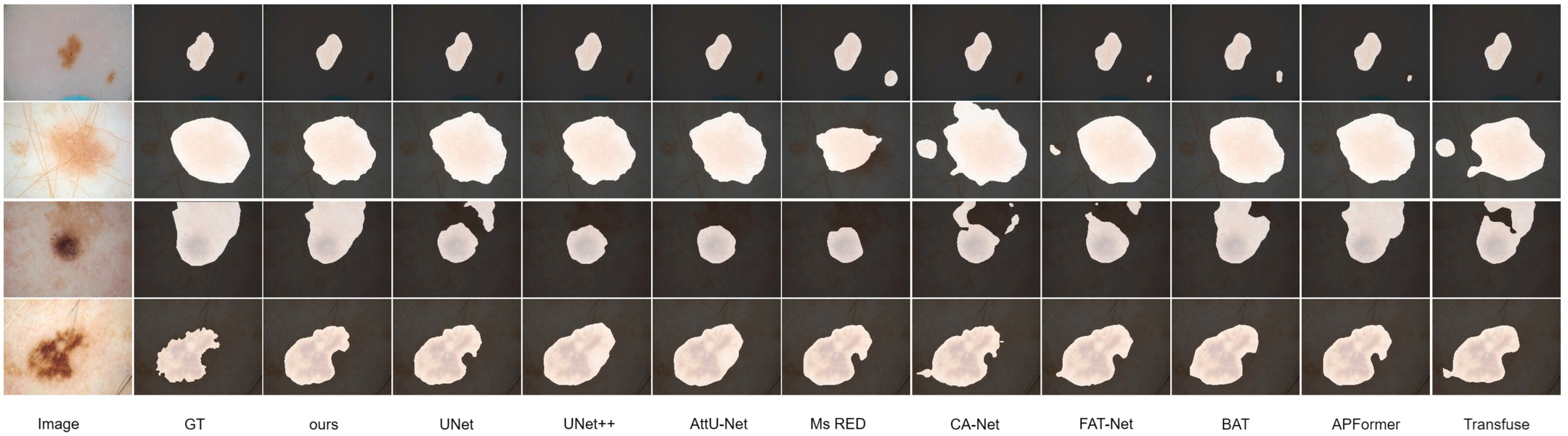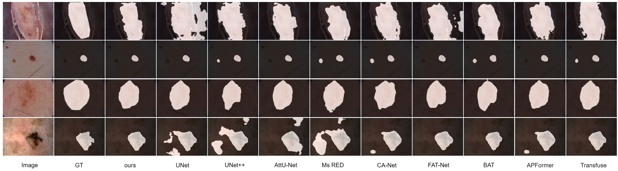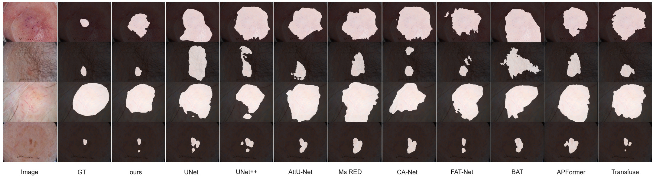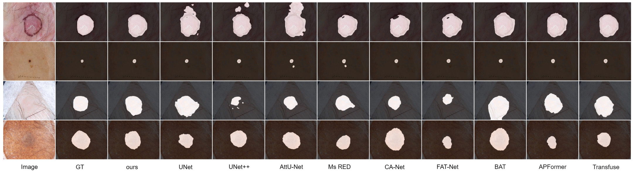 论文还做了可视化对比,从图中能明显看出:Pact-Net 分割出来的病变边界最接近 GT,尤其是在有毛发遮挡、低对比度的复杂场景下 ------ 比如某张图像中病变被毛发挡住了一部分,U-Net 和 Transfuse 都漏判了被遮挡的区域,而 Pact-Net 通过融合局部细节(毛发间隙的病变纹理)和全局信息(病变整体形态),精准分割出了完整的病变区域。