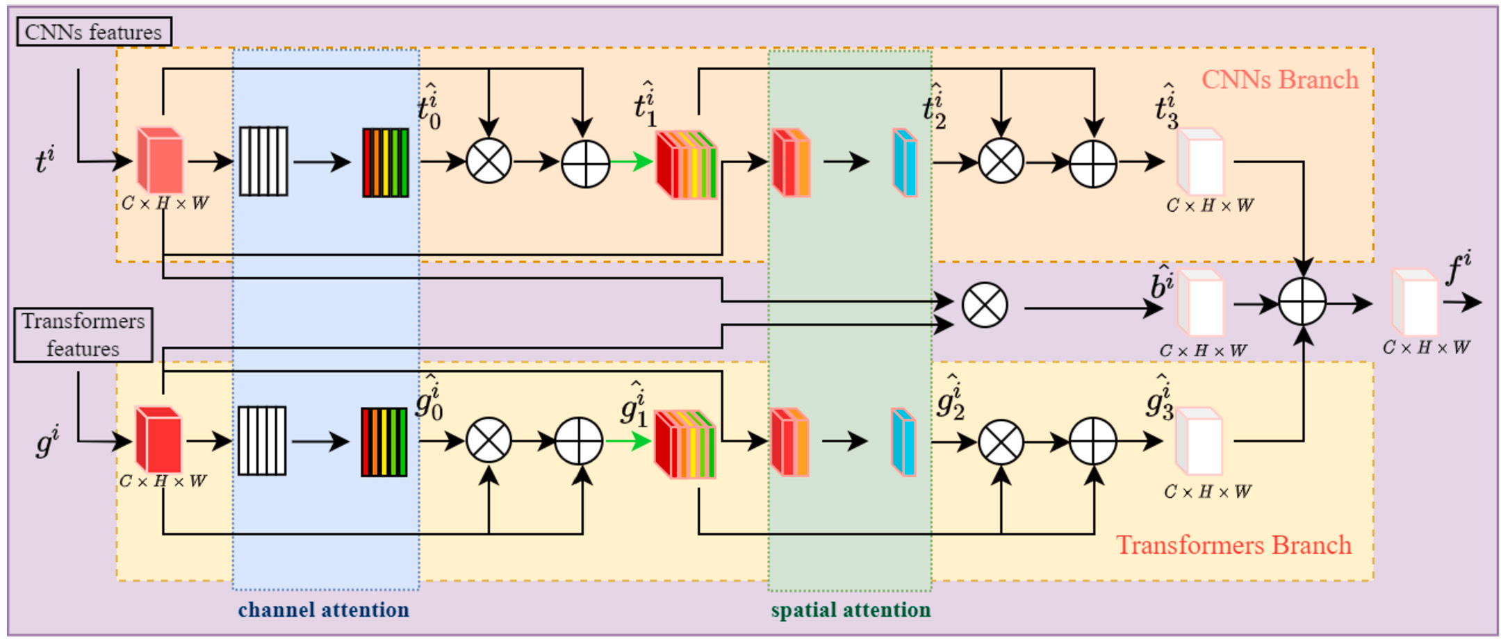 **第二步:计算交互特征。**把 CNN 的局部优化特征和 Transformer 的全局优化特征通过 3×3 卷积层相乘,得到一个 "交互特征"(记为 b^i)。这个特征的作用是捕捉两个分支的关联 ------ 比如 "病变边缘"(局部)和 "病变整体位置"(全局)的对应关系,避免两个分支的特征 "各说各的"。