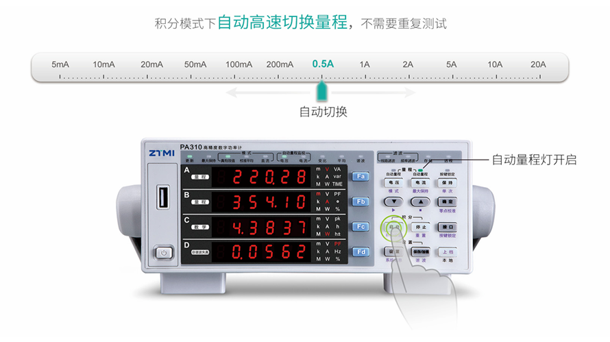 - **高速自动量程:**在负载动态变化的测试过程中,PA310的积分模式可以实现高速、无缝的量程切换,确保采集到的功率数据是连续、完整的。